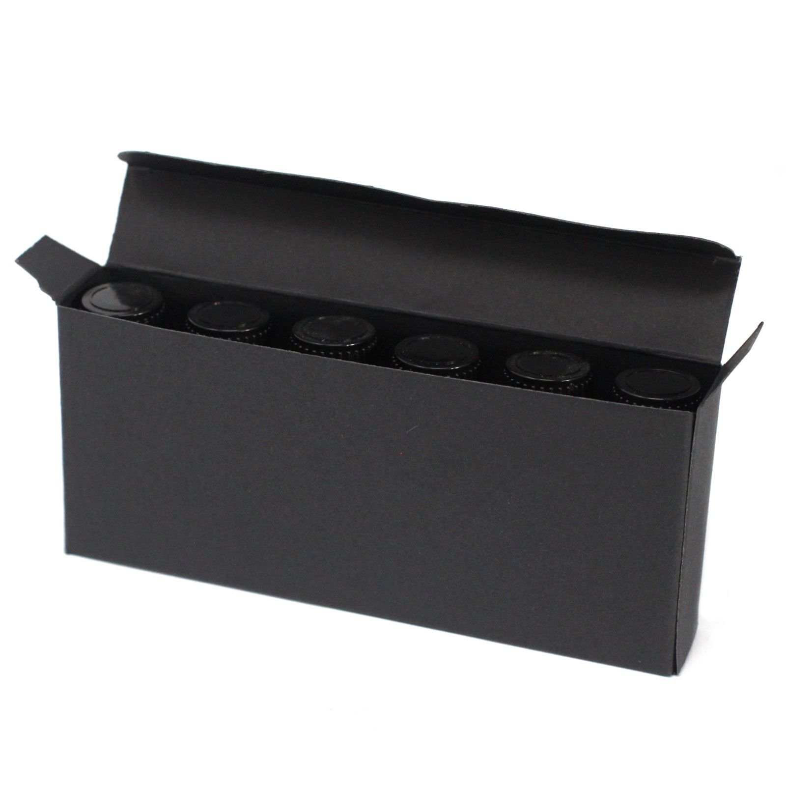 Sophisticated black box for six 10 ml essential oil bottles, perfect for luxurious aromatherapy sets and elegant storage.
