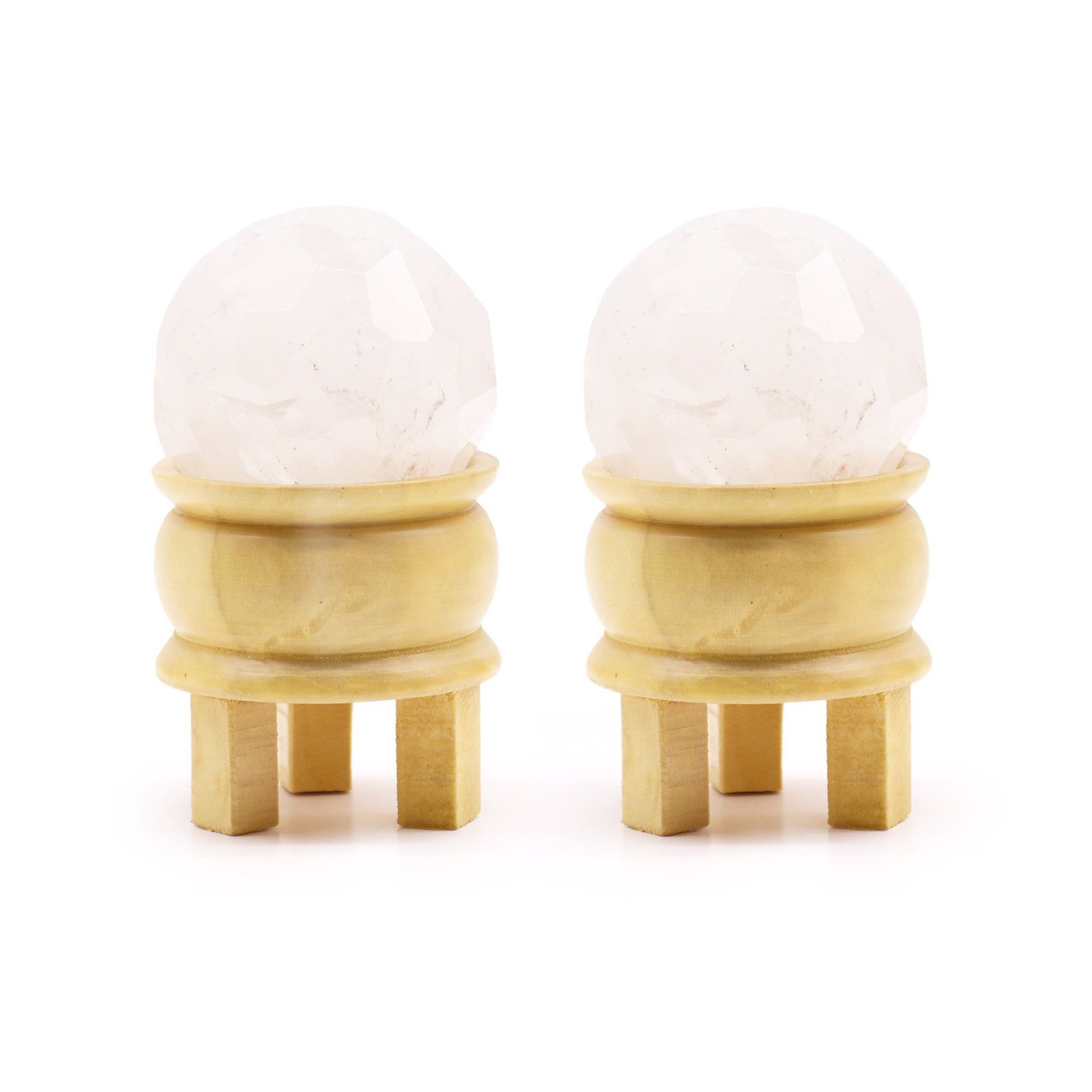 Faceted clear quartz sphere on a wooden stand, ideal for clarity, intention setting and amplifying energy in any ritual or space.