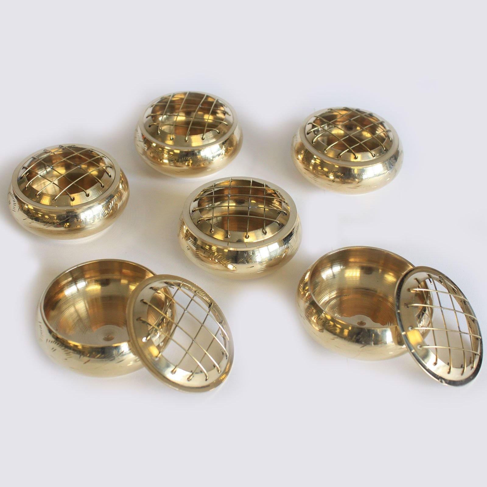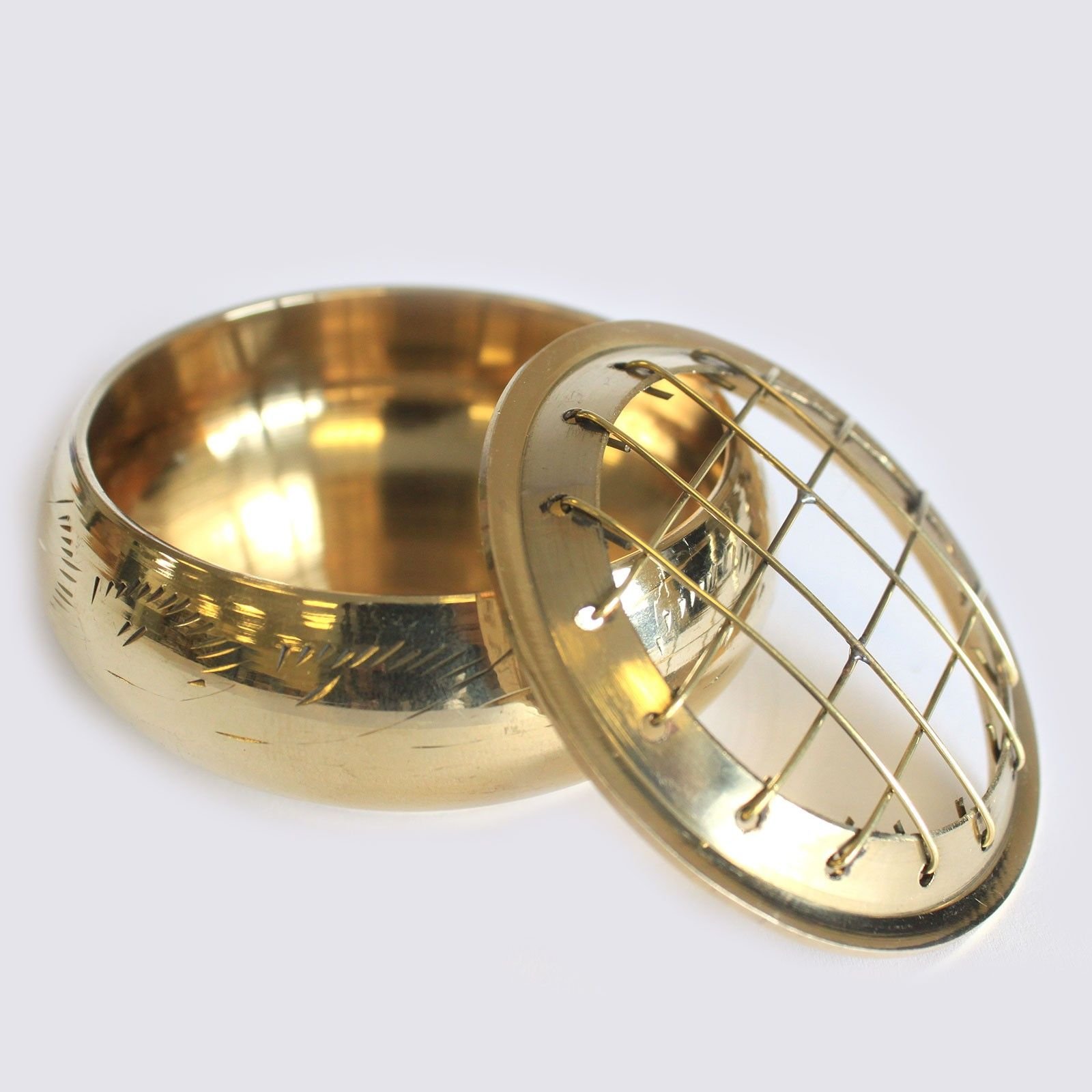 Compact brass incense jar for charcoal, resins, and herbs, with a removable grid lid for even heat and gentle fragrance release.
