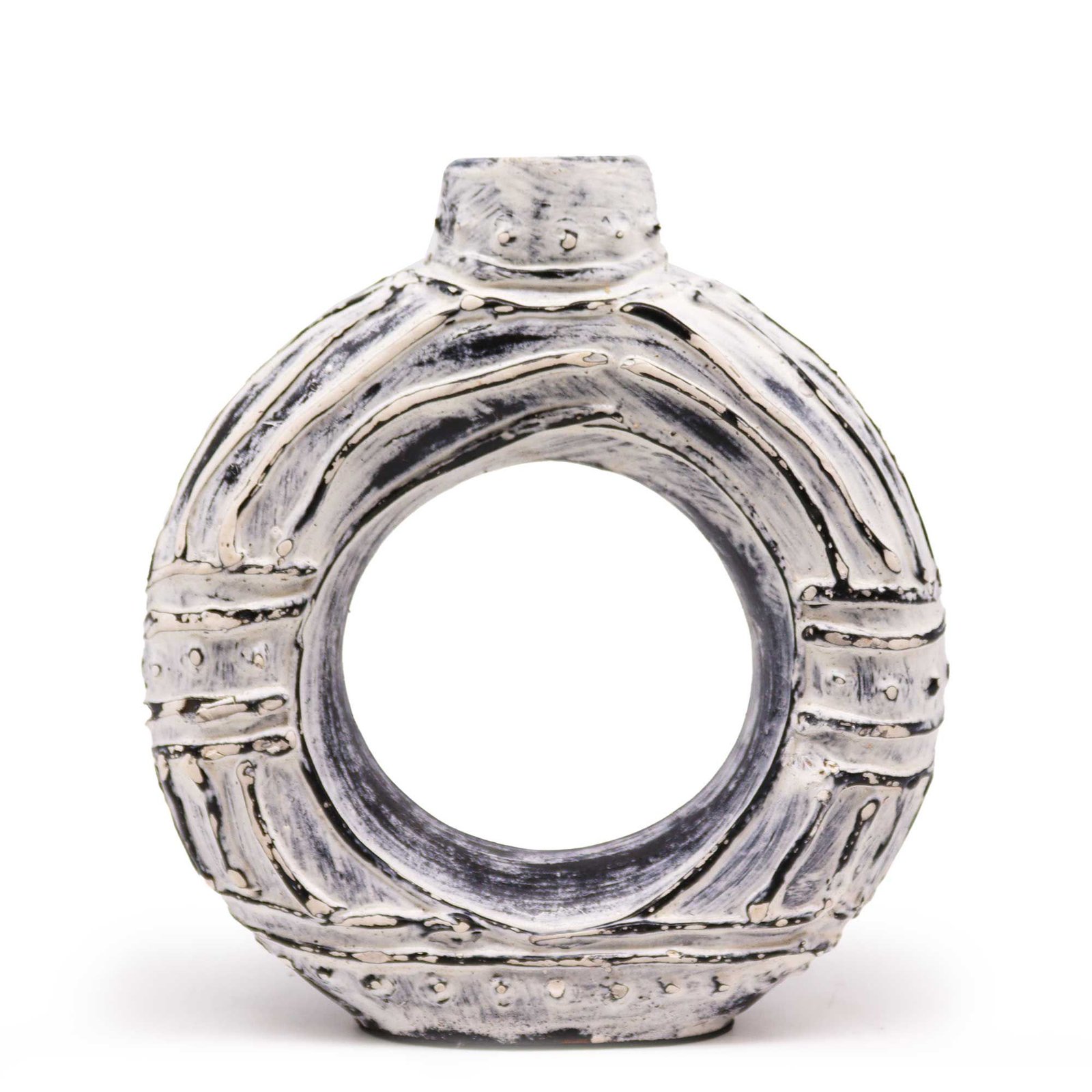 This compact sculptural vase brings quiet elegance to any interior. Crafted from terracotta in a distinctive round donut silhouette, it is finished in a soothing cream tone that pairs beautifully with neutral or earthy palettes.