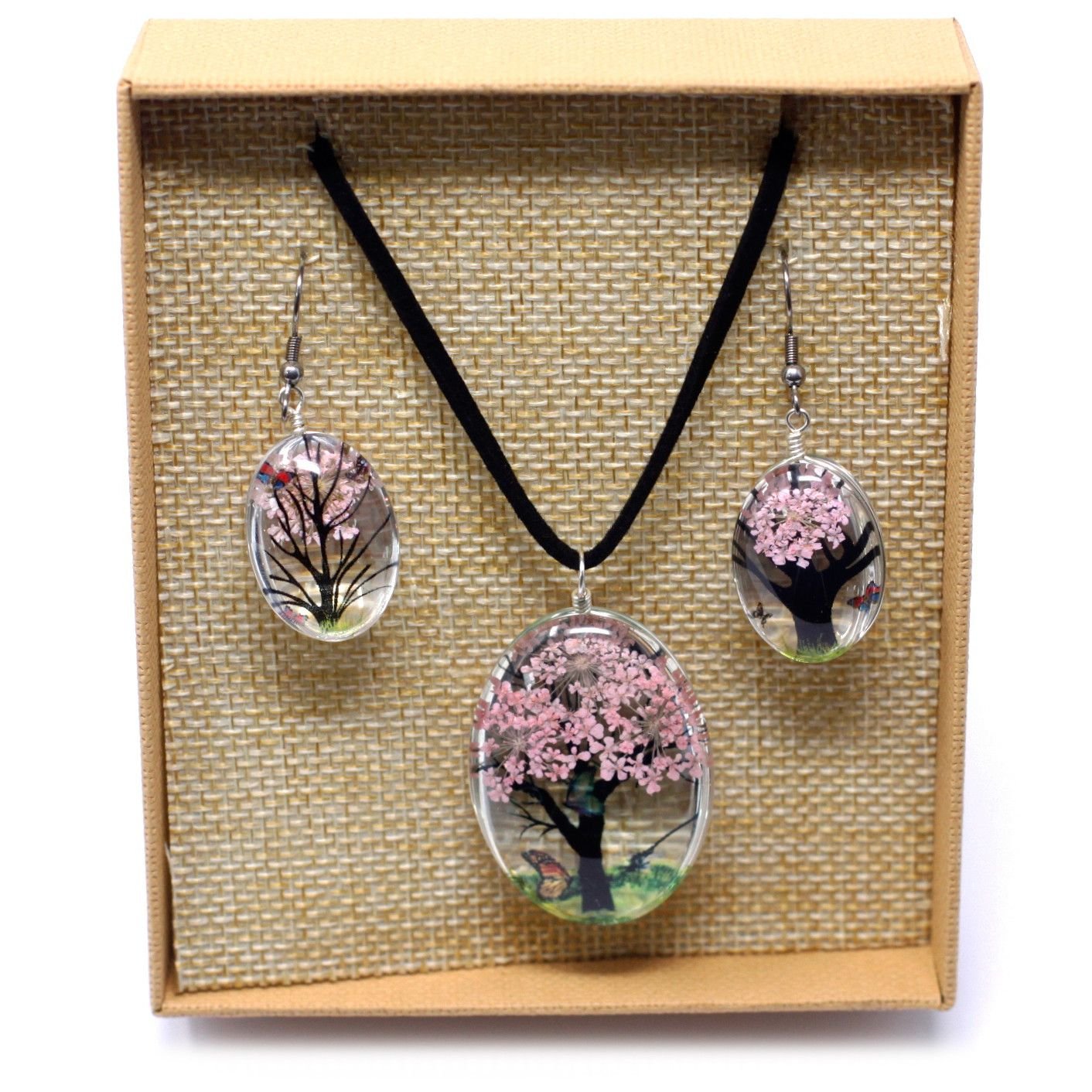 Romantic Tree of Life jewelry set with real pink pressed flowers in glass, each piece naturally unique.